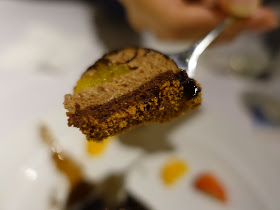 甜點「巧克力阿爾卑斯鑲薑味慕斯柳橙果凍」很讓人驚豔的擺盤,切開裡面有著豐富的內層,綿軟的巧克力慕斯與柳橙軟凍,吃起來不像看似那麼堅硬,其實是一個非常滑軟的口感,打碎的開心果搭配著巧克力甜點,非常德奧風格的作法!這份甜點的口感多元而精彩,還可以搭配著旁邊的水果享用,讓每一口都充滿變化且相當曼妙!