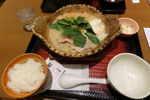 季節限定的酒粕豬肉鍋定食,在寒冷的1月吃,真的非常溫暖,熱騰騰的上桌,嫩豆腐在類似味噌的湯汁裡煮得暖呼呼的,豬肉也薄嫩好吃。